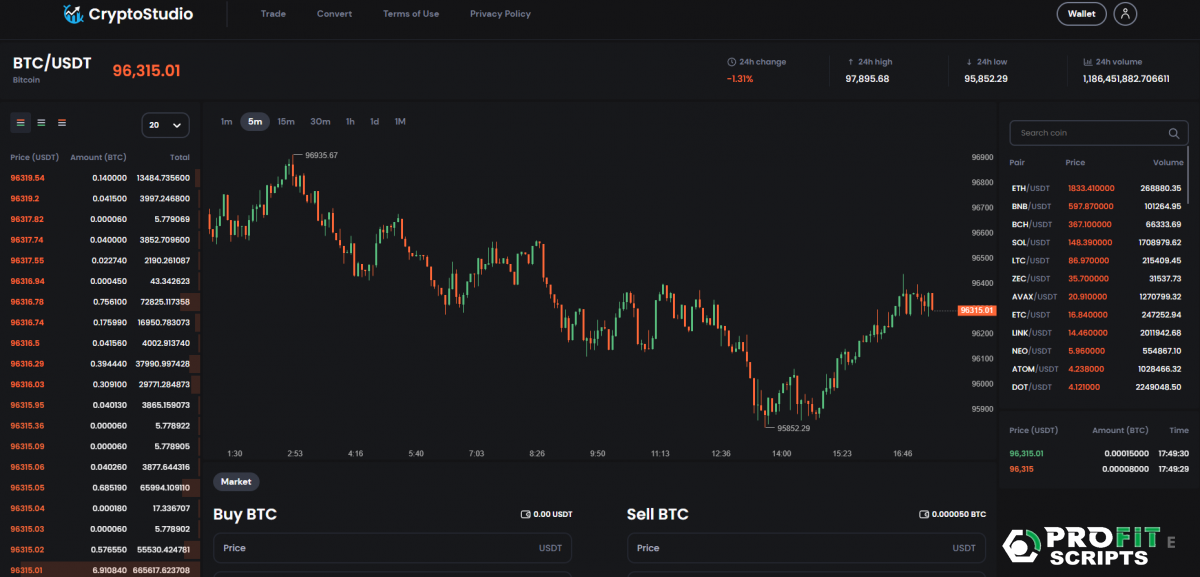 Этот PHP-скрипт представляет собой полноценную платформу криптовалютной биржи, интегрированную с Binance API для обеспечения надежной и эффективной торговли. Скрипт предоставляет пользователям следующие возможности: